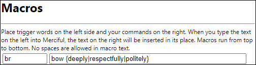 Place options between two curly brackets and Merciful will automatically update your text when you hit space or enter.
